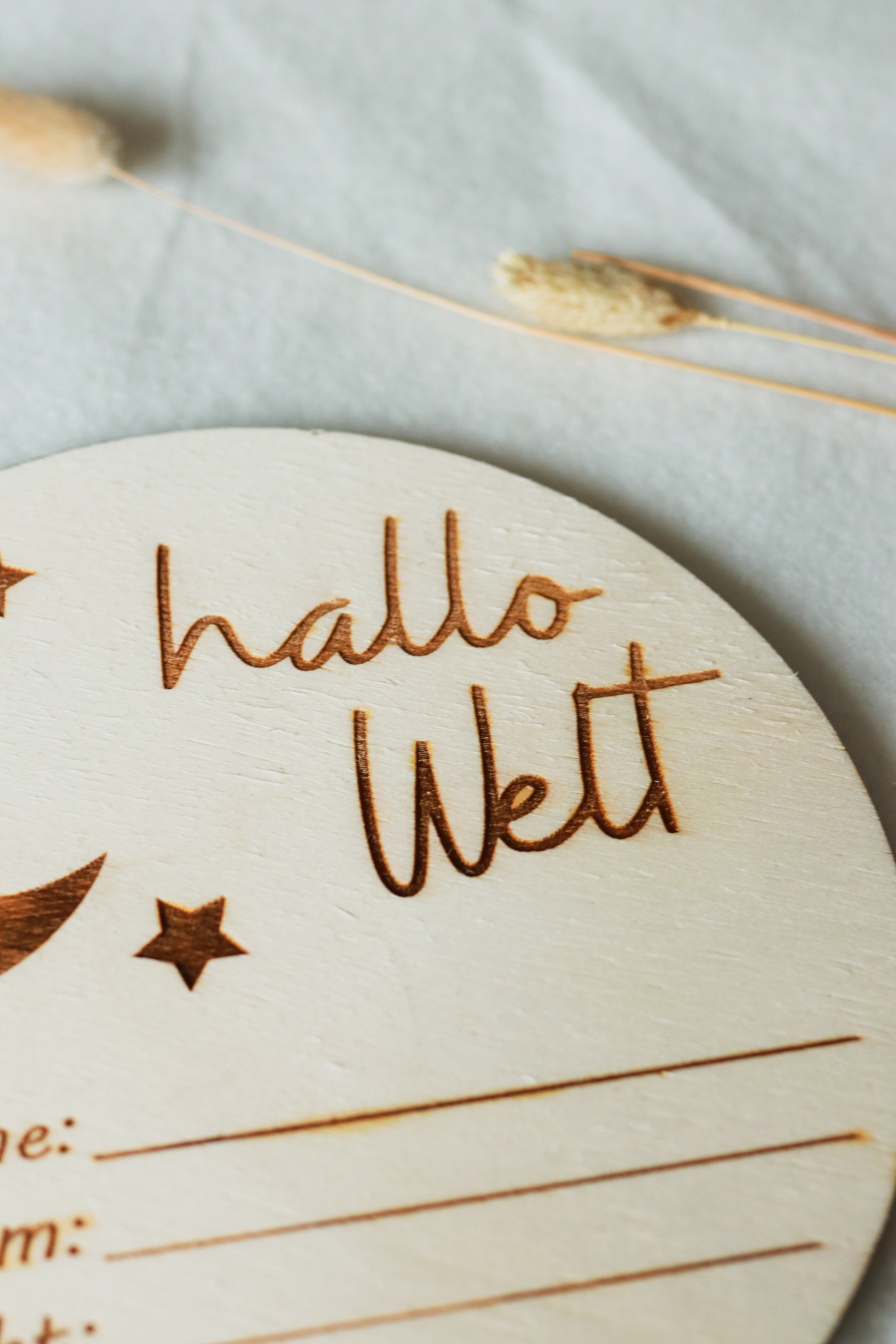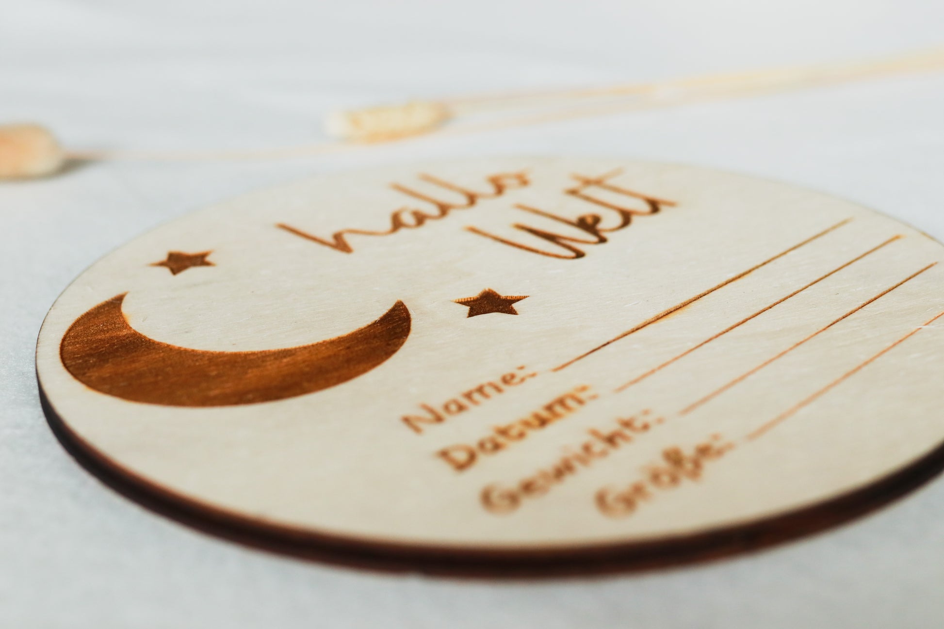 Unser wunderschönes Holzschild zur Geburt mit der Gravur NAME, DATUM, GEWICHT, GRÖSSE ist ein liebevolles Andenken an den schönsten Tag im Leben eines Elternpaares. Dieses personalisierte Schild wird individuell mit den wichtigsten Informationen des Neugeborenen gestaltet und ist eine wunderbare Möglichkeit, den besonderen Moment der Geburt festzuhalten. Hergestellt aus hochwertigem Holz, bietet es nicht nur eine charmante Dekoration für das Kinderzimmer, sondern auch einen bleibenden Erinnerungswert für die ganze Familie. Ein ideales Geschenk zur Geburt, das mit viel Liebe und Sorgfalt gefertigt wurde und den Eltern ein Lächeln ins Gesicht zaubern wird.