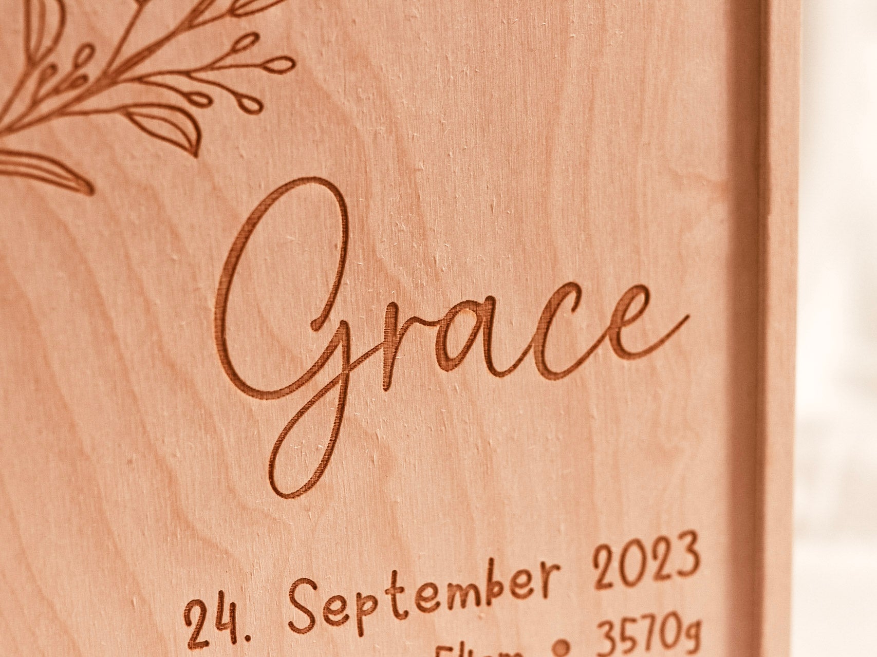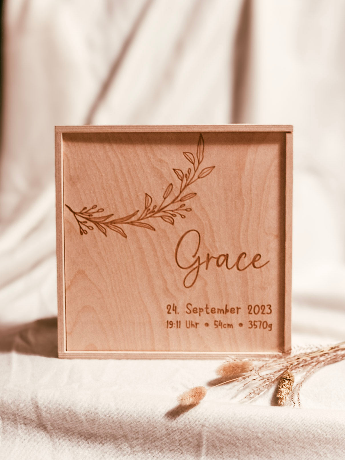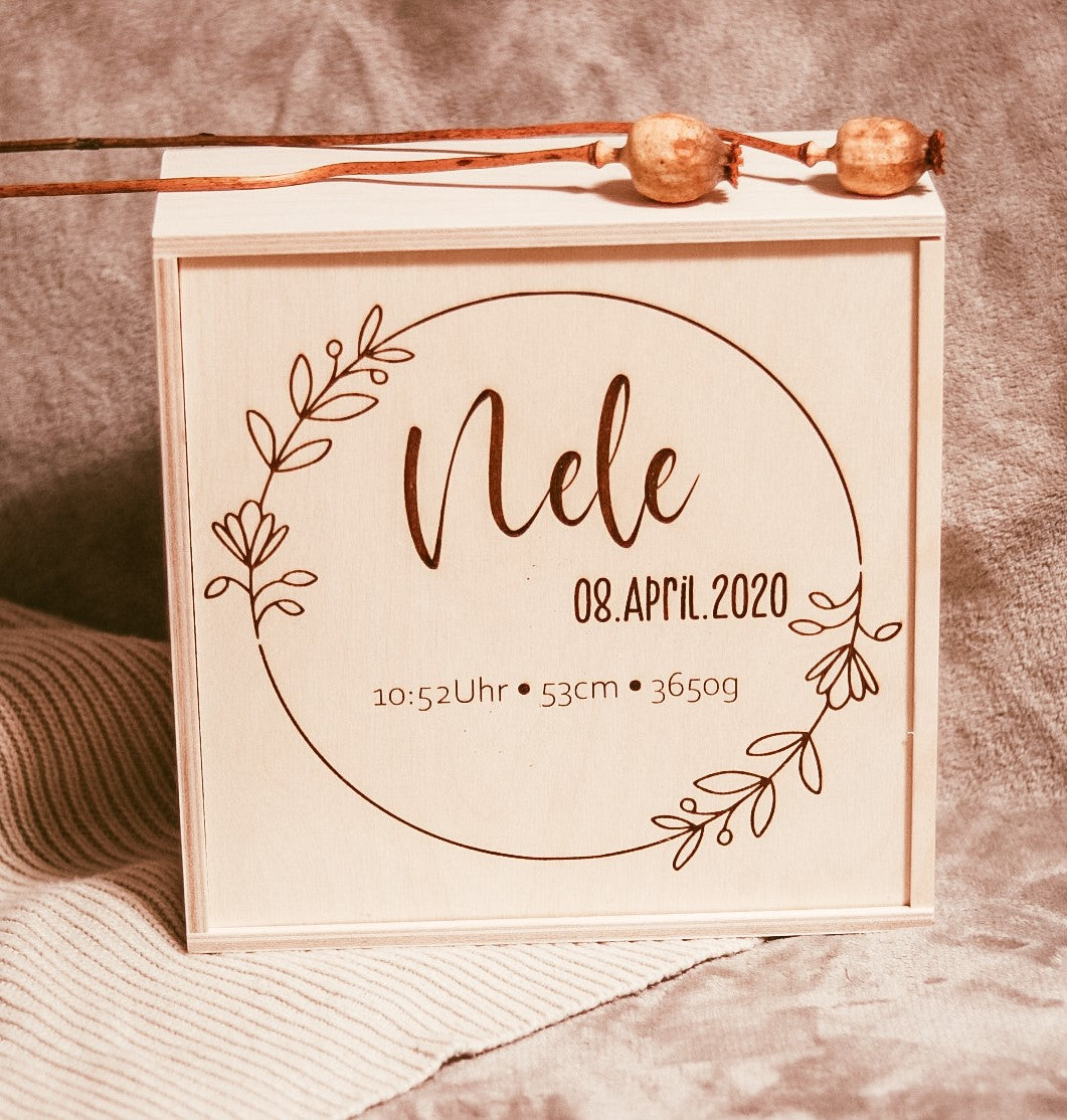 Bewahre die einzigartigen Erinnerungen deines Kindes in unserer wunderschönen Holz Erinnerungsbox auf. Mit einer individuellen Gravur der Geburtsdaten und des Namens deines Kindes, bietet diese Box einen zeitlosen Charme und einfachen Zugang zu den kostbaren Erinnerungen. Ein unverzichtbares Erbstück für die Familie.